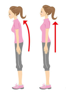 というのは 「やらなきゃ」「やらなきゃ」 って、動いている時って、ものすごく姿勢が前のめりなんです。ちょっとそういう時の自分を思い出してほしいんですが、この図の左みたいに、肩に力がはいって、前のめりになっていませんか?